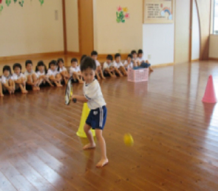 ボールを打つ、走る、体のバランスをとるといった基本的な動作を通して運動能力の向上を図っています。