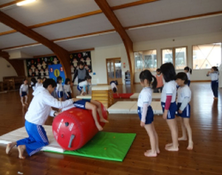 3才以上児を対象に、体操指導員から基礎トレーニングやマット運動、跳び箱などの指導を受けています。